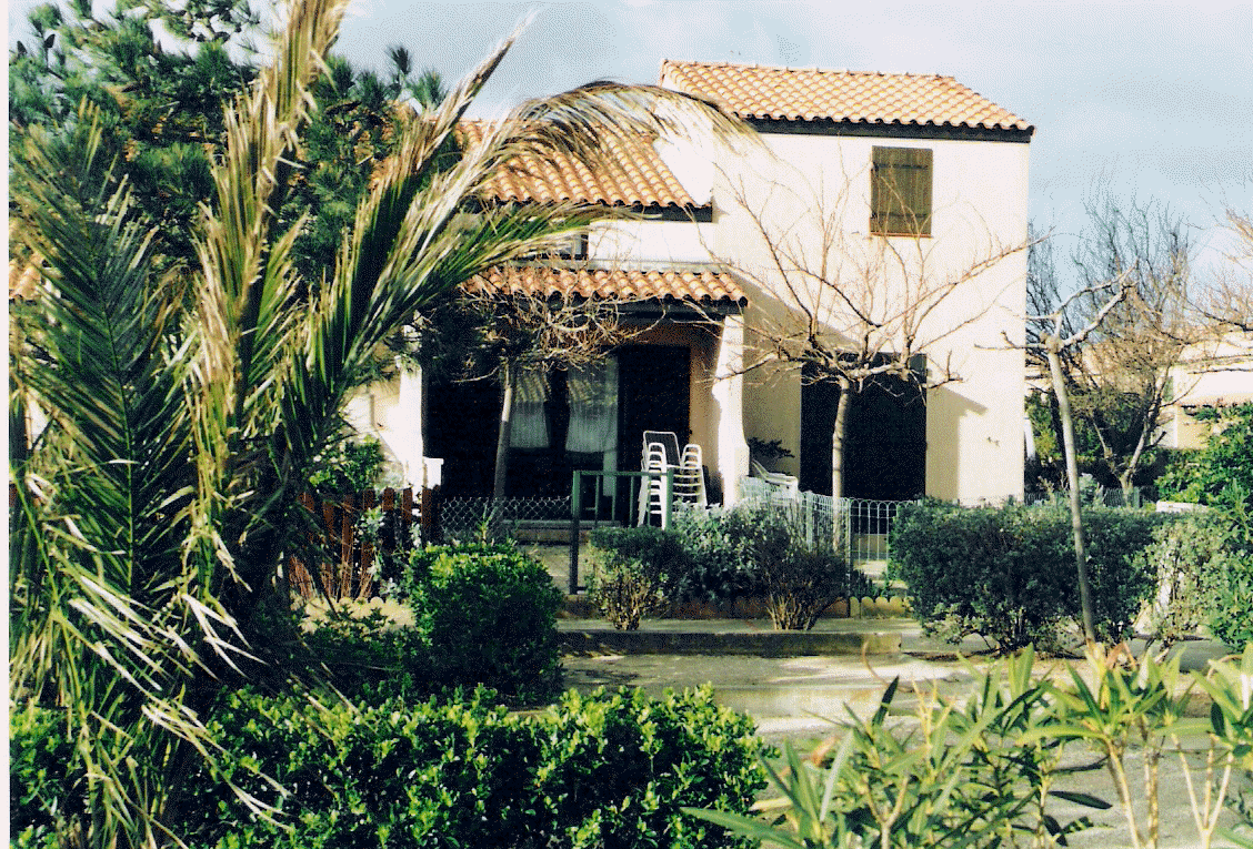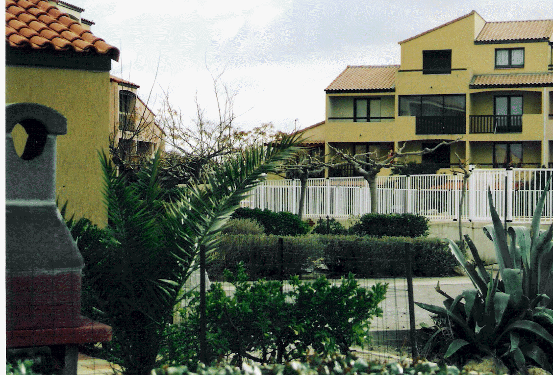View from communal gardens of terrace at No. 13, Les Barcarelles (with stacked chairs). / Vue des jardins communaux de la terrasse du No 13, Les Barcarelles (avec les chaises).